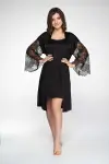 Родзинкою моделі є широкі довгі рукави, декоровані розкішним ажурним мереживом, яке додає образу витонченості. Довжина халата трохи вище колін, що робить його одночасно зручним і спокусливим. Ідеальний варіант для домашнього відпочинку, створення стильного образу або вишуканого подарунка.
