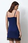Силует сорочки — на тонких бретелях, довжиною до середини стегна — зручний і універсальний. Виріб прикрашений мереживом із квітковими мотивами: делікатна обробка по декольте та широка мереживна смуга по низу створюють образ, що балансує між лаконічністю та жіночністю. Усі елементи мережива — handmade, виконані вручну з любов’ю до деталей.