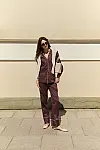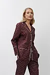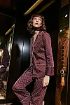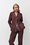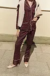 Верх у сорочковому стилі з двома кишенями та золотистими ґудзиками, декорований контрастним окантуванням по манжетах, кишенях, вирізі горловини та штанах. Штани прямого крою з кишенями доповнені поясом із зав’язкою з тієї ж тканини для ідеальної посадки.