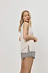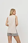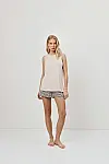 Колір — бежевий топ у поєднанні з шортами в чорно-кремовому геометричному принті.
