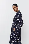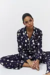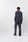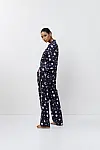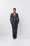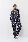 Піжамний комплект класичного крою зі штанами, виконаний у темно-синьому кольорі з принтом зірок і галактик у бежево-золотистих тонах — стильний вибір від Aruelle!