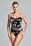 Купальник виконаний зі стильним принтом у чорному та тілесному кольорах, що виглядає елегантно та підкреслює силует. Модель має ущільнену чашку на об'єм B/C без кісточок і без push-up, із знімними вкладишами для комфортної підтримки грудей. Суцільний крій забезпечує зручну посадку та комфорт під час відпочинку на пляжі або біля басейну.