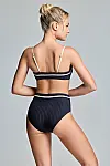 Купальник виконаний із фактурної ребристої тканини з бежевими смугами. Еластичні краї забезпечують надійну та комфортну посадку. Модель ідеально підходить для плавання, засмагання та створення стильних курортних образів.